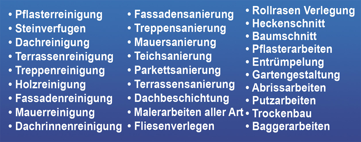 Für unsere Kunden reinigen wir Terrassen, Höfe, Eingänge und Wege. Auch Ihre Zufahrten, Garagen und Parkplätze lassen wir im neuen Glanz erstrahlen!